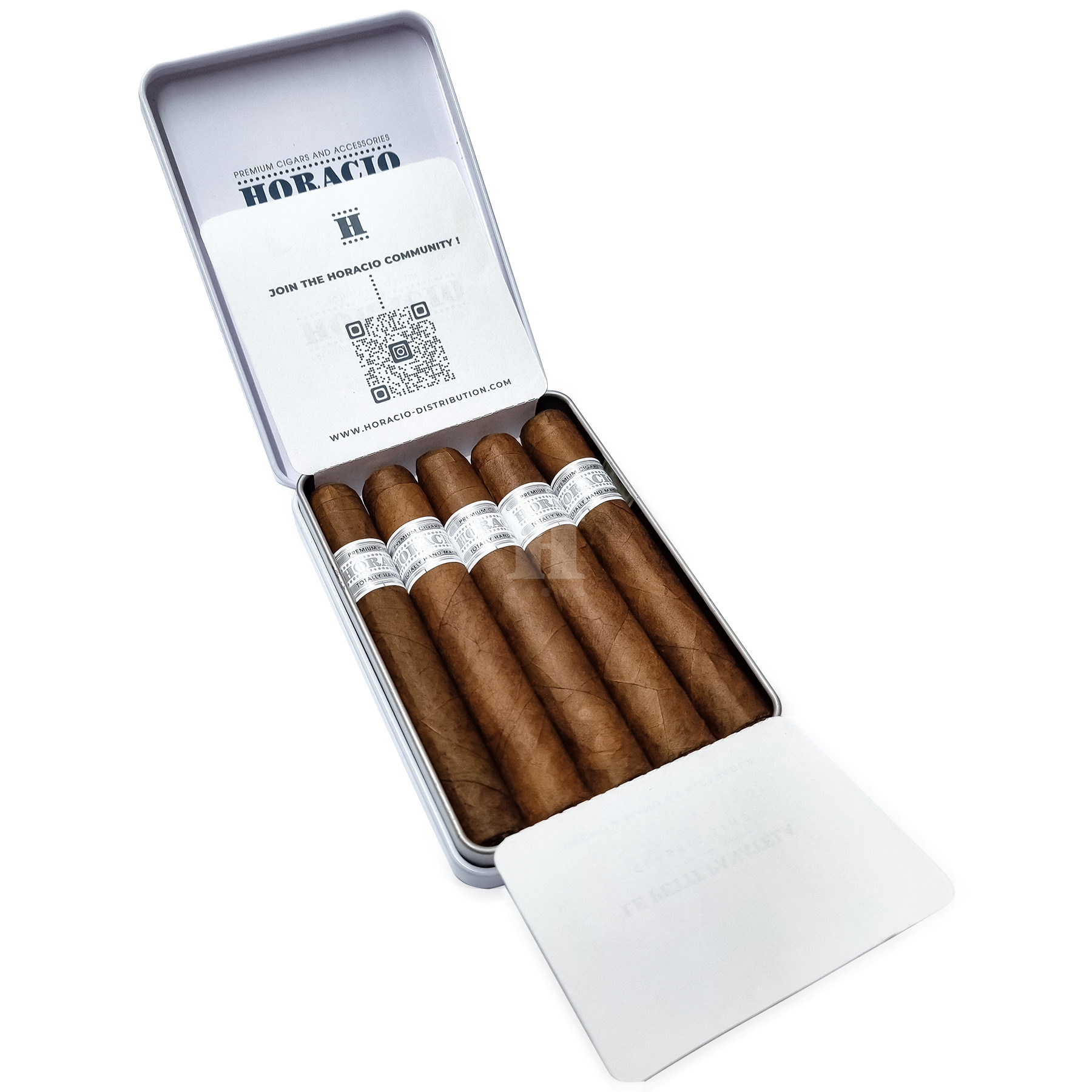 Presentado en un estuche metálico elegante y resistente que contiene 5 puros, este formato protege eficazmente los puros durante el transporte y facilita su conservación diaria.